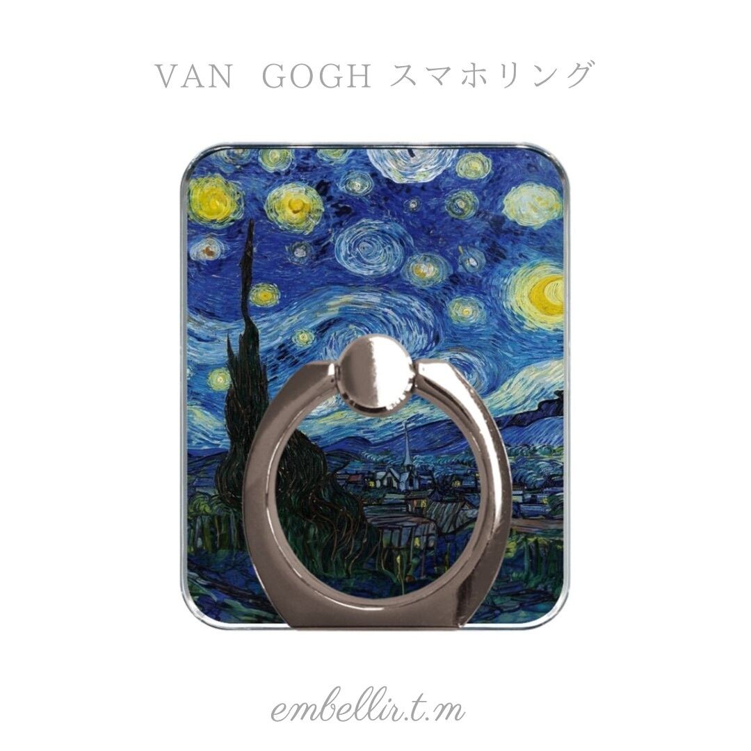 ゴッホの名画「星月夜」をモチーフにした絵画のスマホリング。このスマホリングは、手のひらに収まる大きさで、普段使いのスマートフォンにアートを取り入れた特別なひと時を楽しめます。