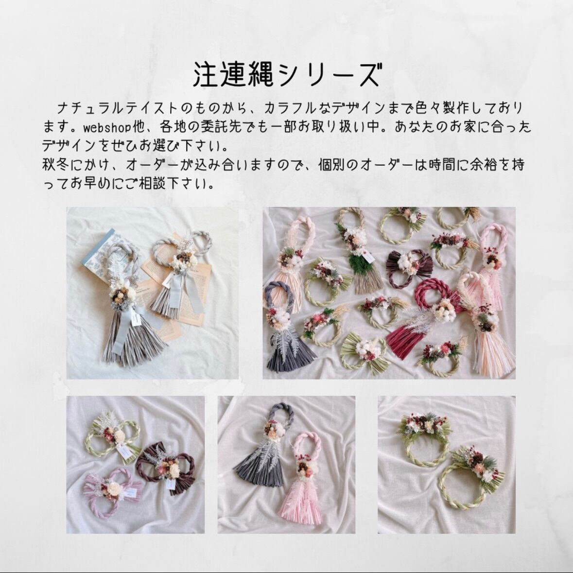 ▶︎素材・・・紙素材しめ縄、木の実、紫陽花、バラの実、カスミソウ、ユーカリ、プリザーブドグリーンのヒムロスギ、麻紐、針金、タグ、リボン。