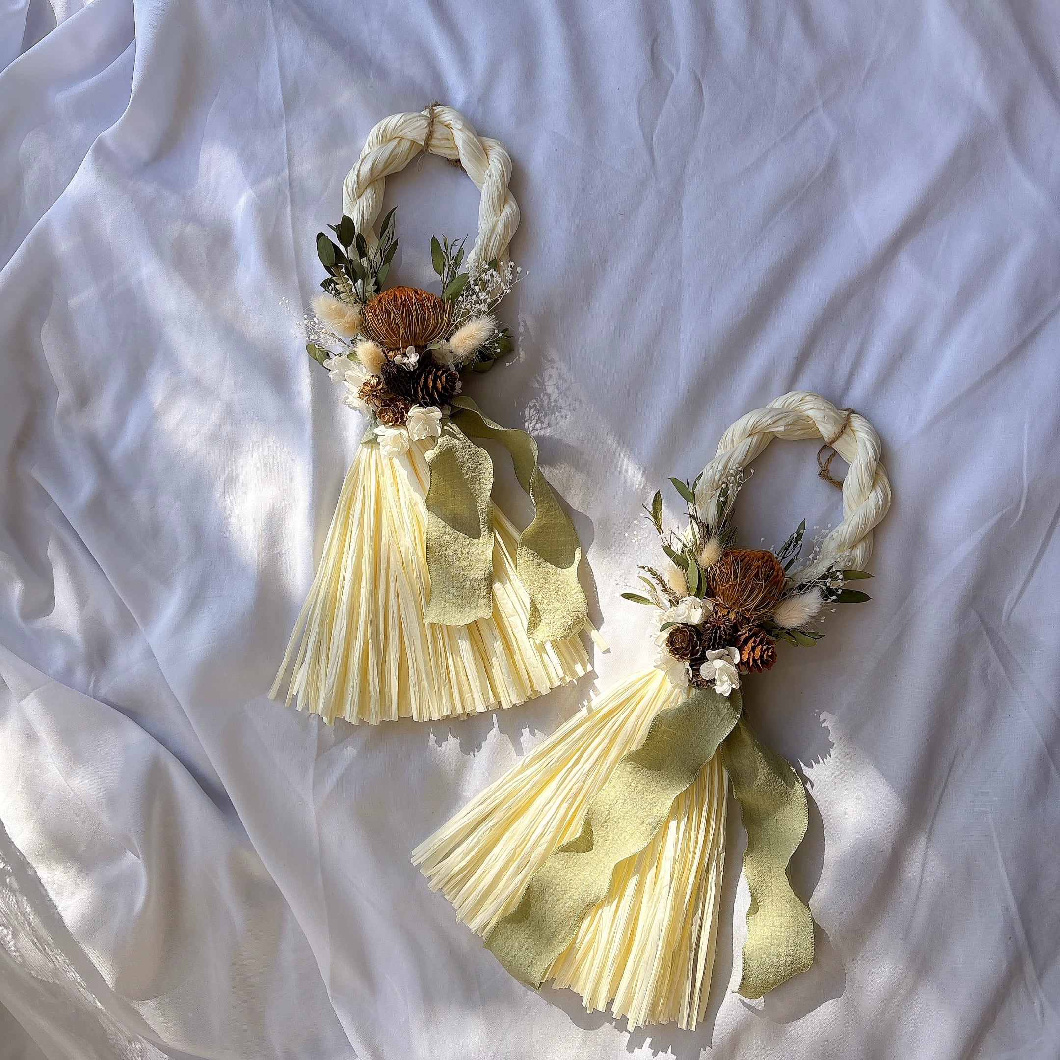 ▶素材・・・紙しめ縄、タッセル、木の実、ドライフラワー、プリザーブドフラワー、麻紐、リボンなど。