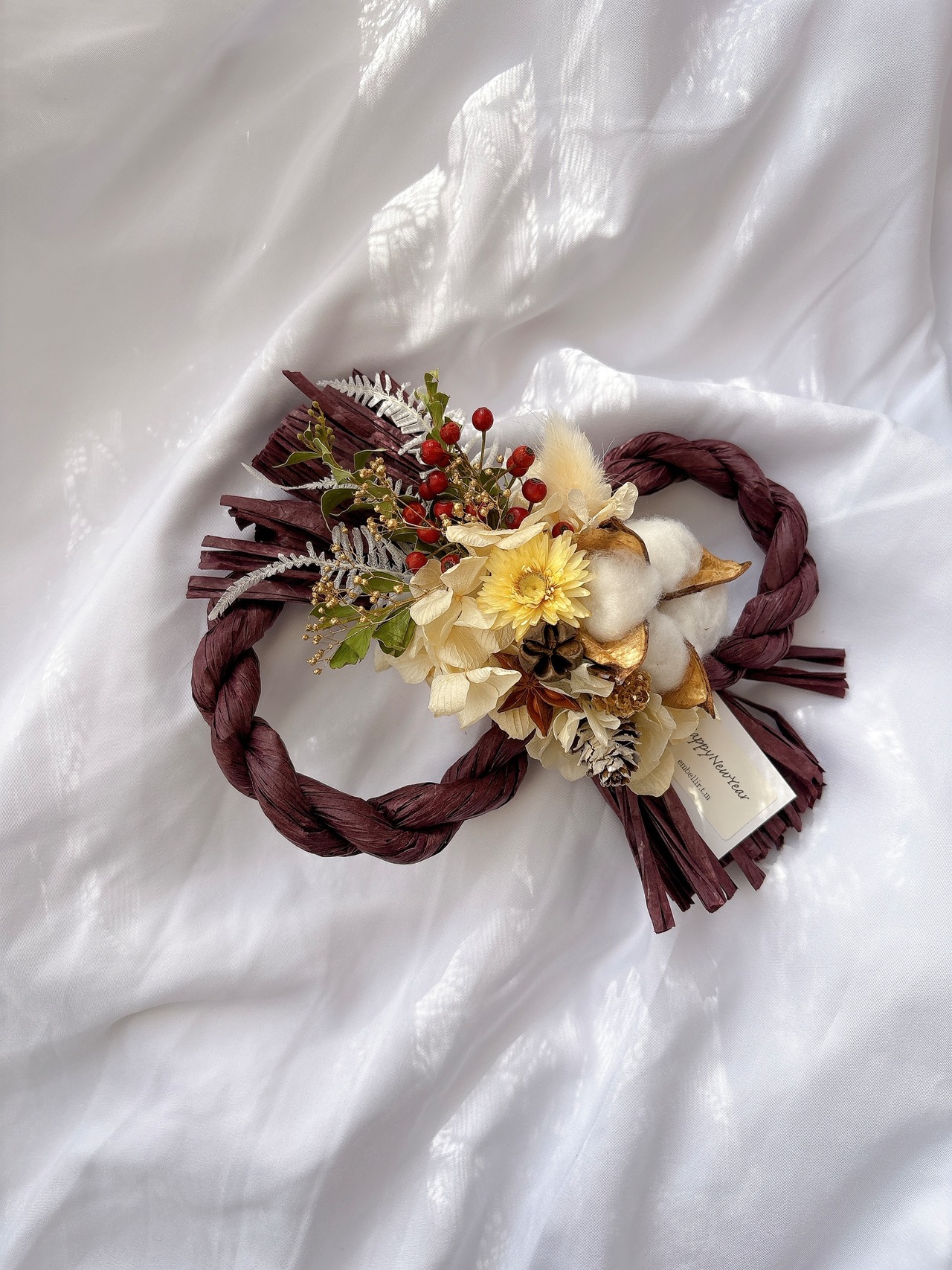 ☆素材・・・紙素材しめ縄、木の実、紫陽花、わた、カミソウ、麻紐、針金、タグ、グルーガンなど。
