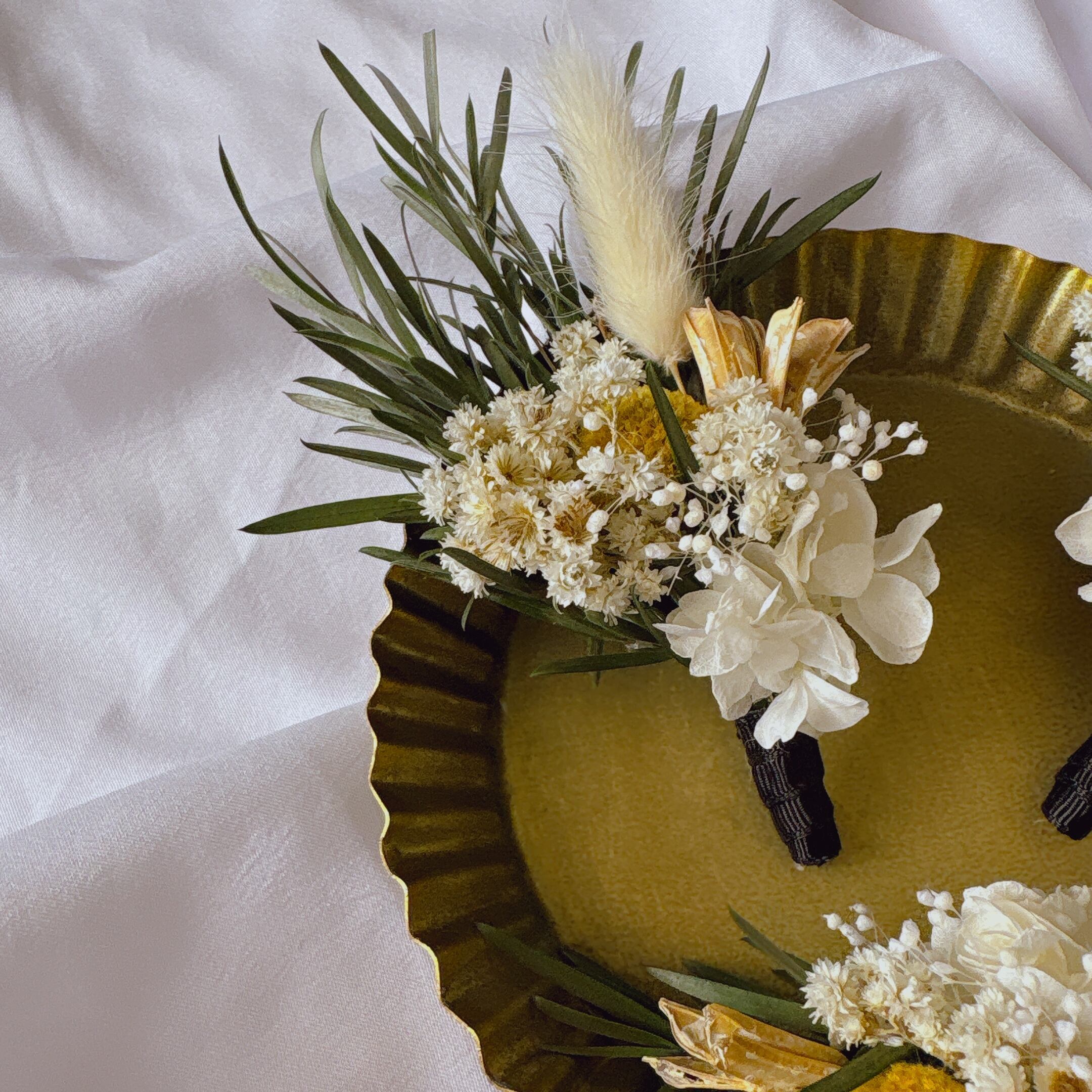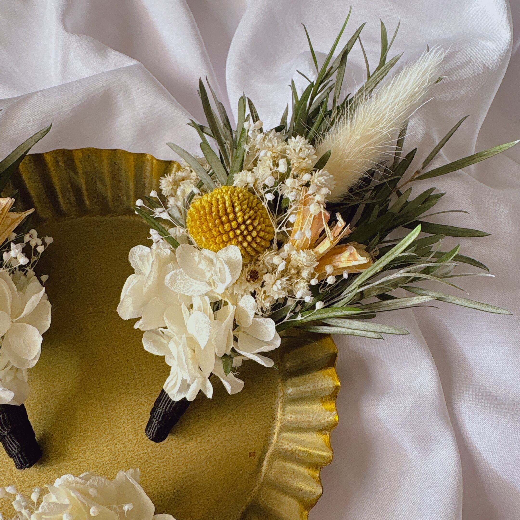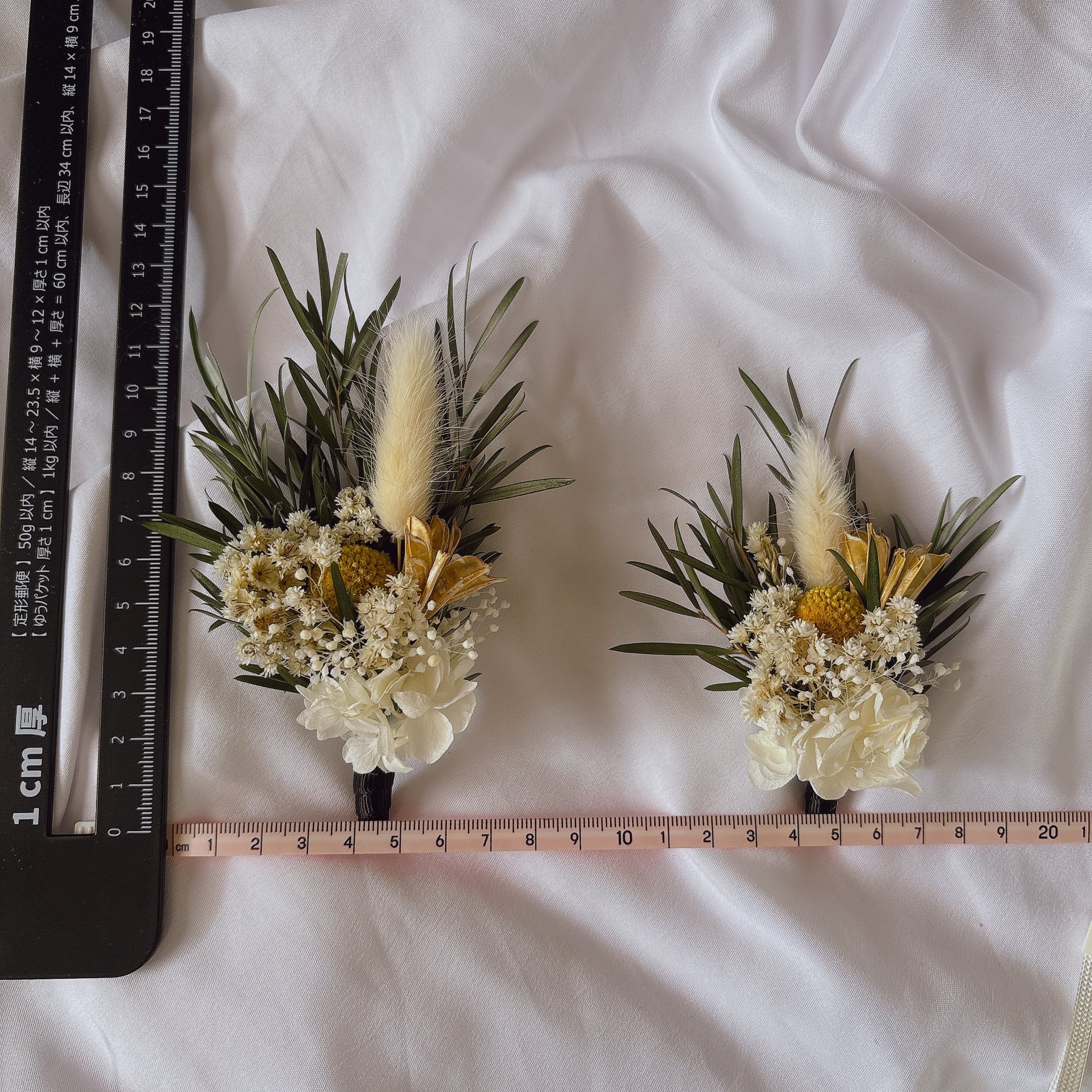 ドライフラワーの 母子草 とプリザーブドフラワーの 紫陽花・かすみ草 を中心に、グリーンの ティーツリー を束ねたやさしく華やかな印象のコサージュです。