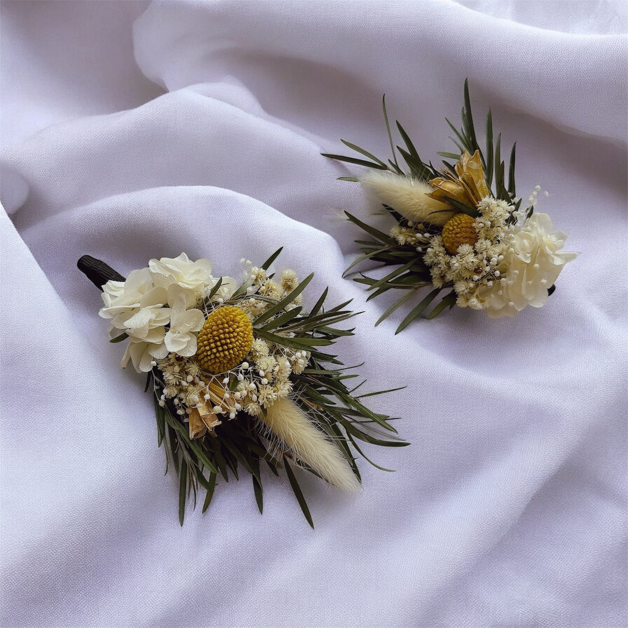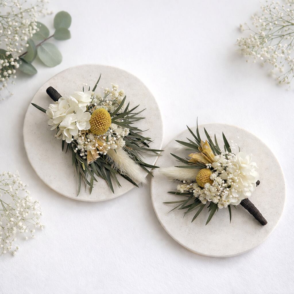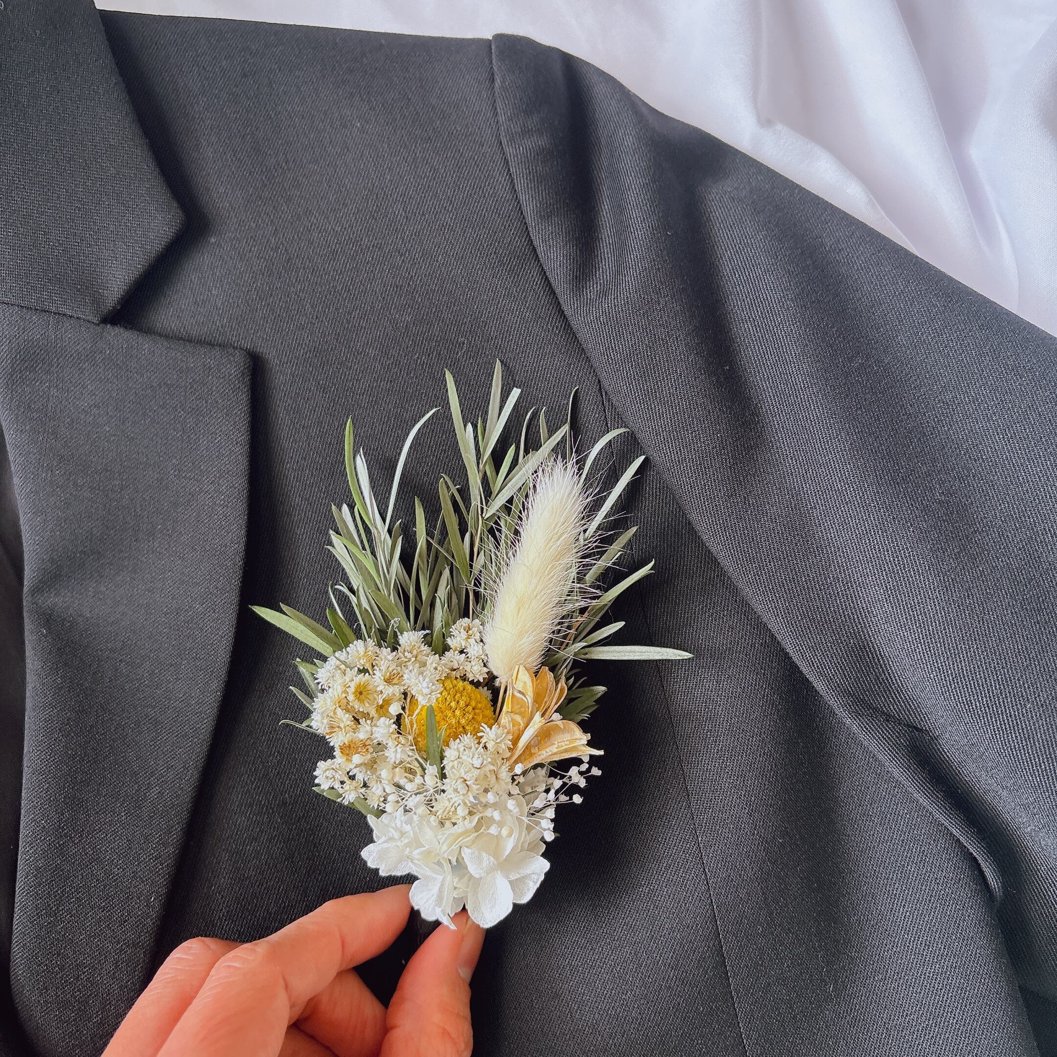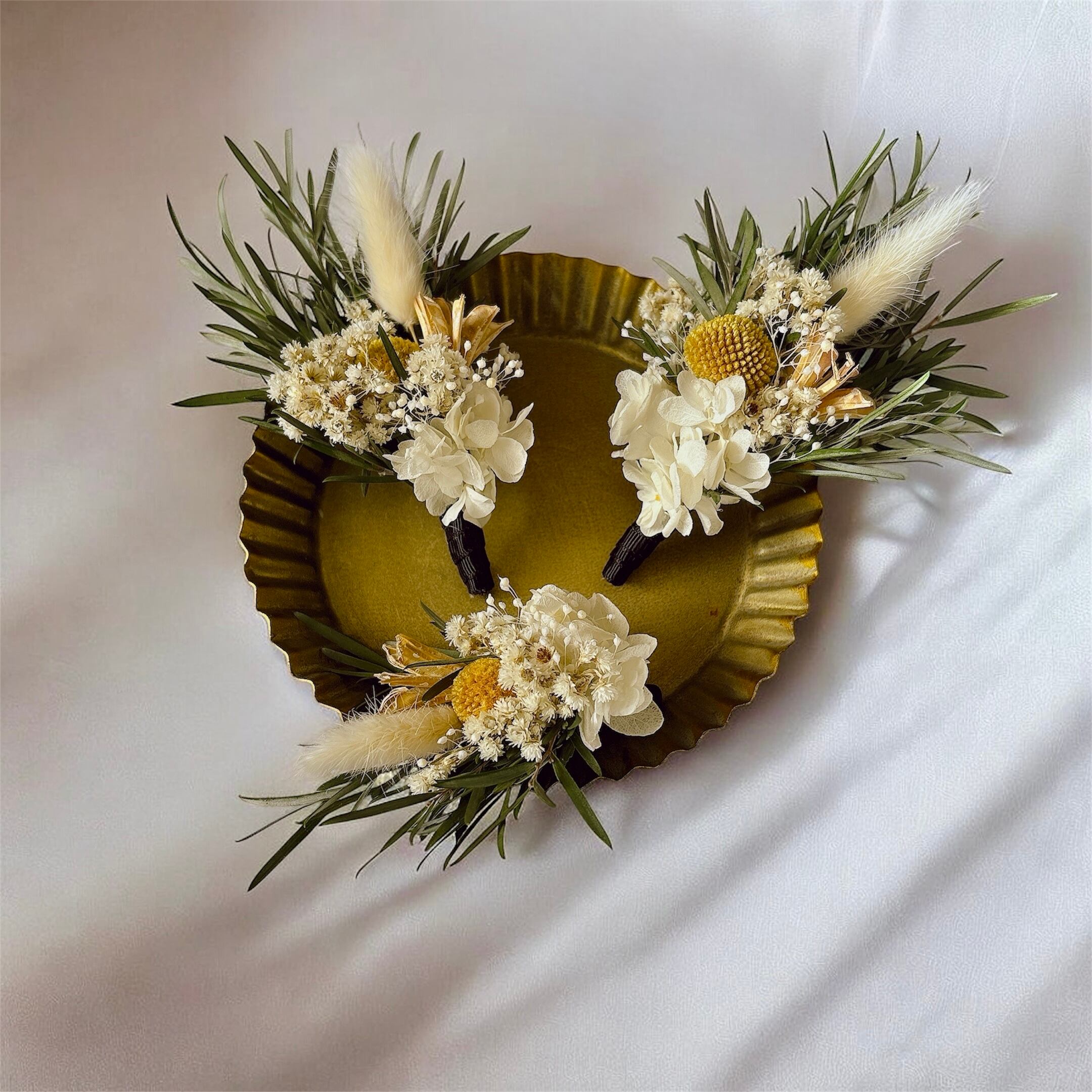ドライフラワーの 母子草 とプリザーブドフラワーの 紫陽花・かすみ草 を中心に、グリーンの ティーツリー を束ねたやさしく華やかな印象のコサージュです。