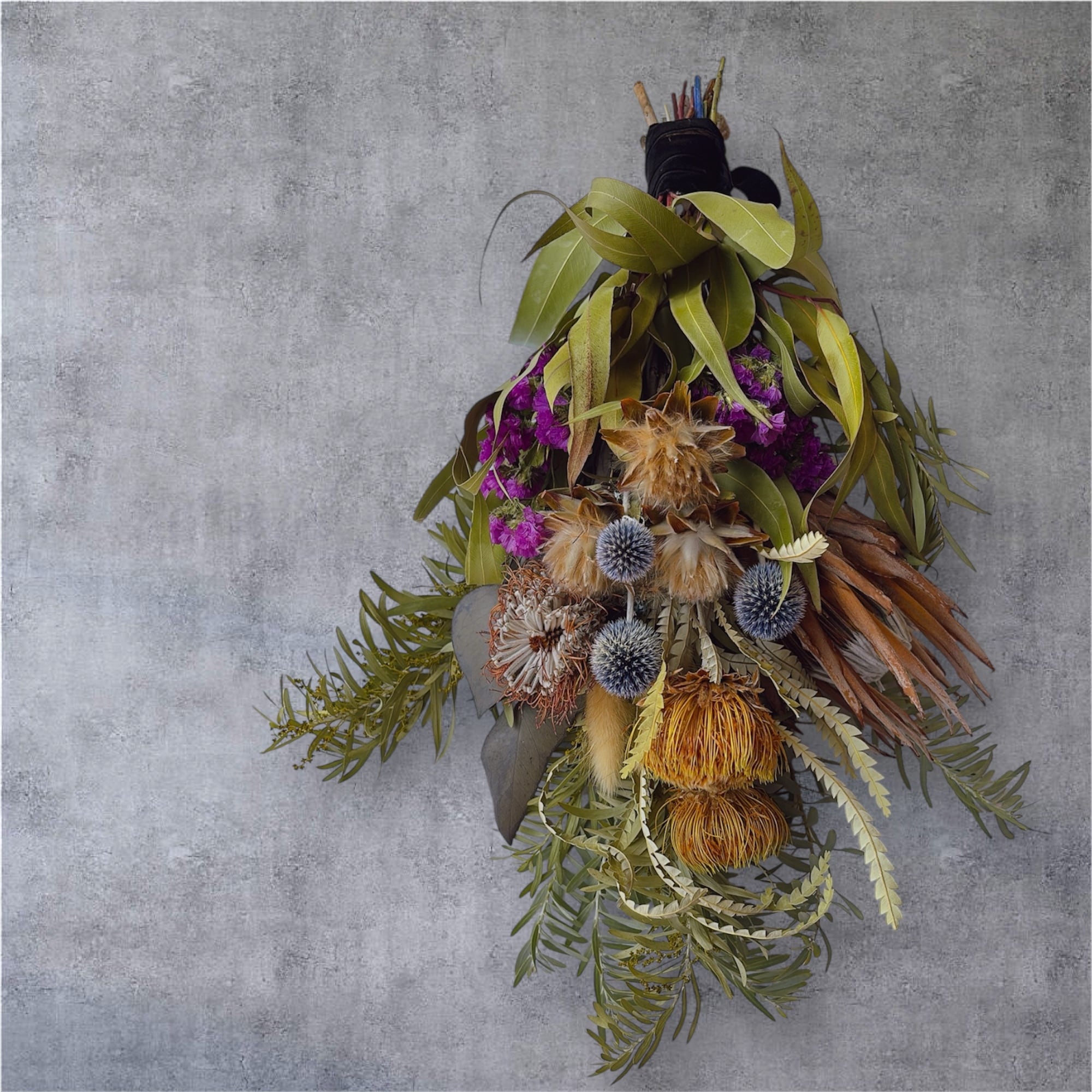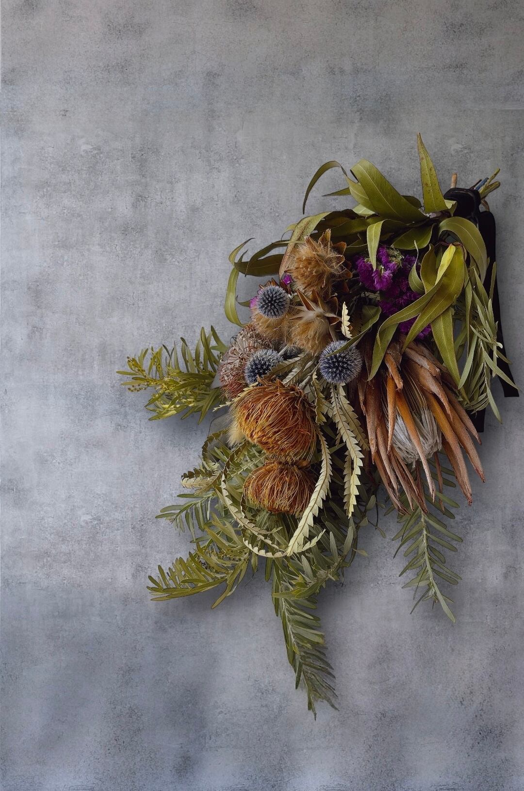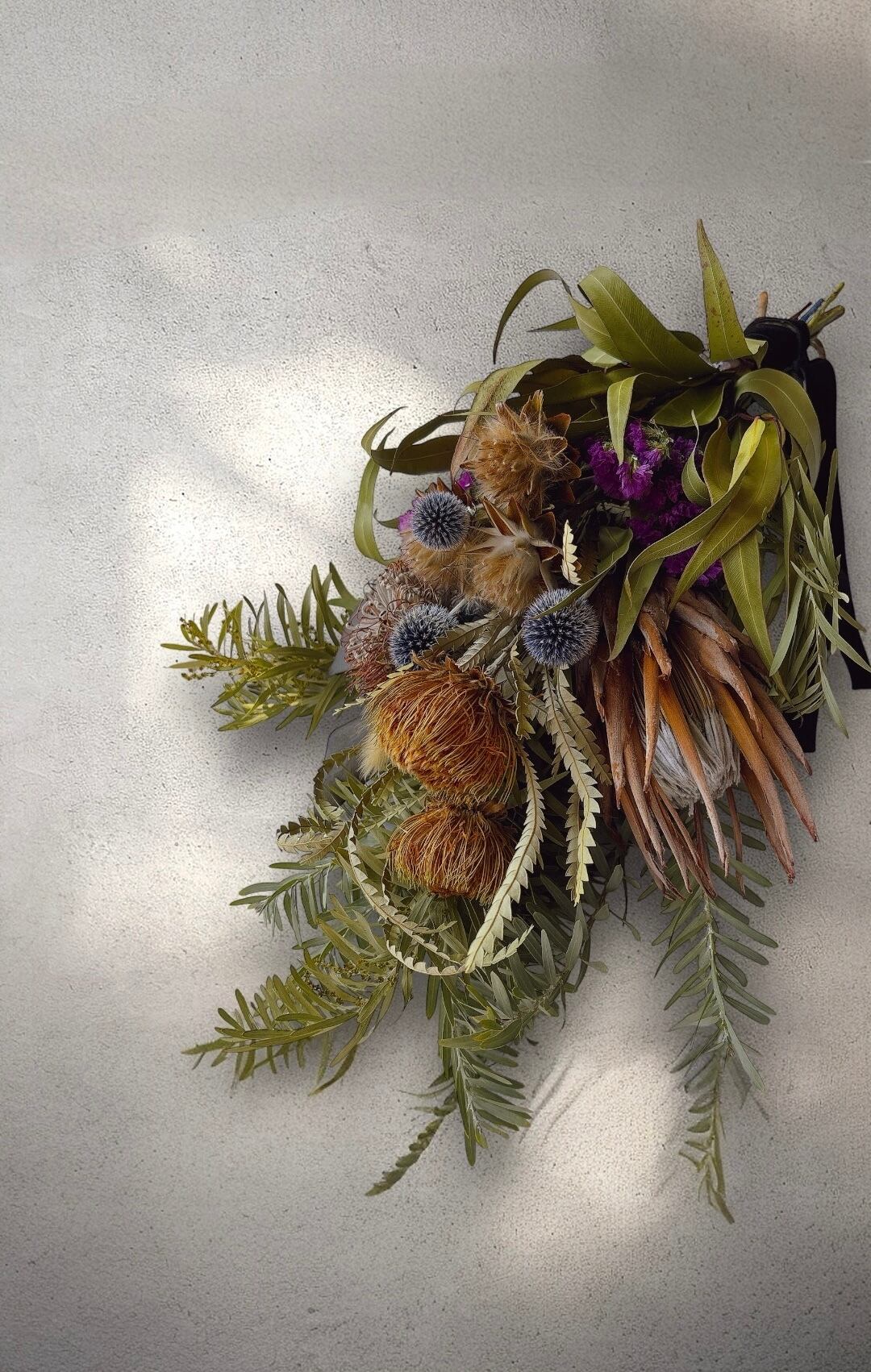ネイティブフラワーを贅沢に使用した、オリジナルのスワッグです。自然の美しさをそのまま活かしたデザインは、お部屋のインテリアに調和し、温もりと癒しの空間を演出します。