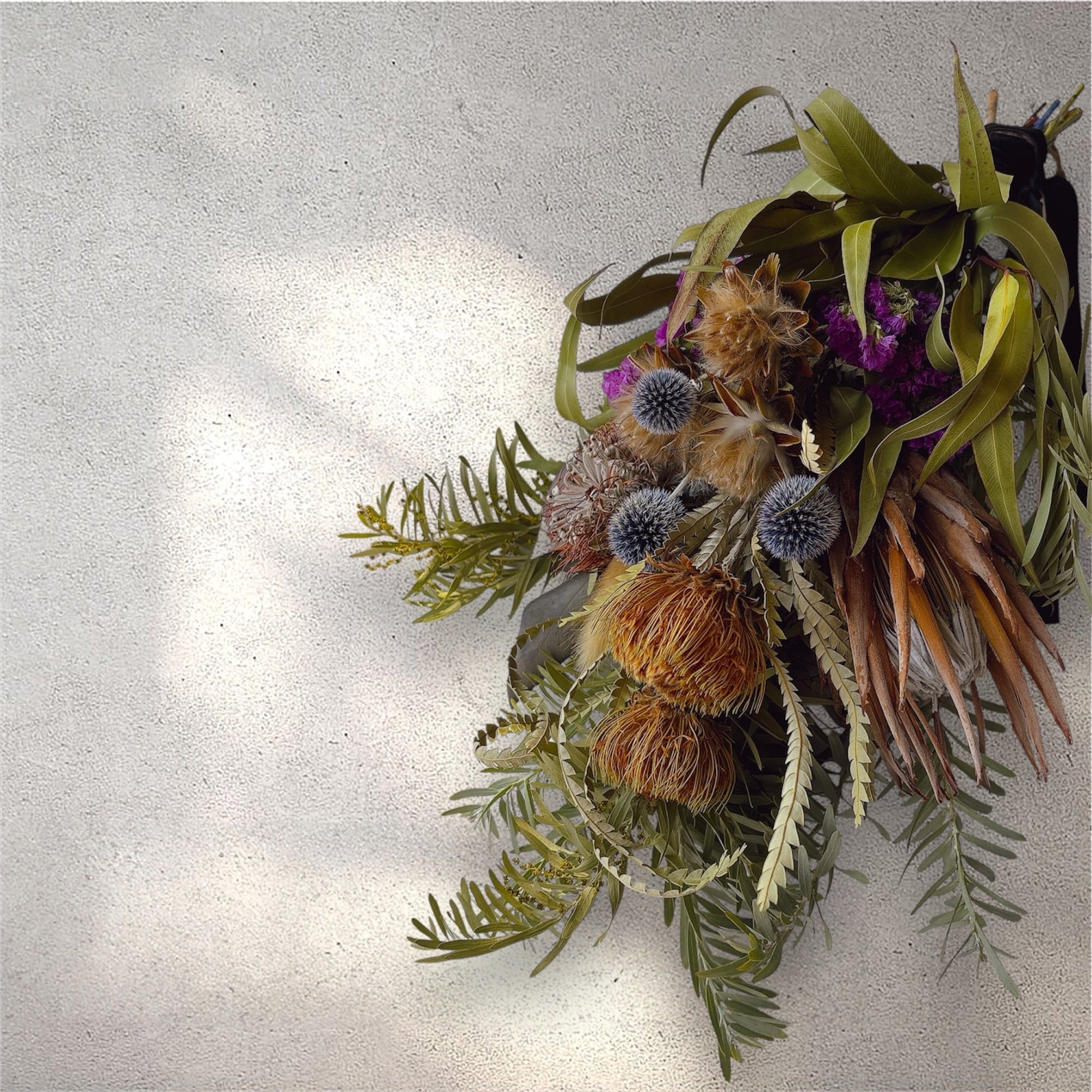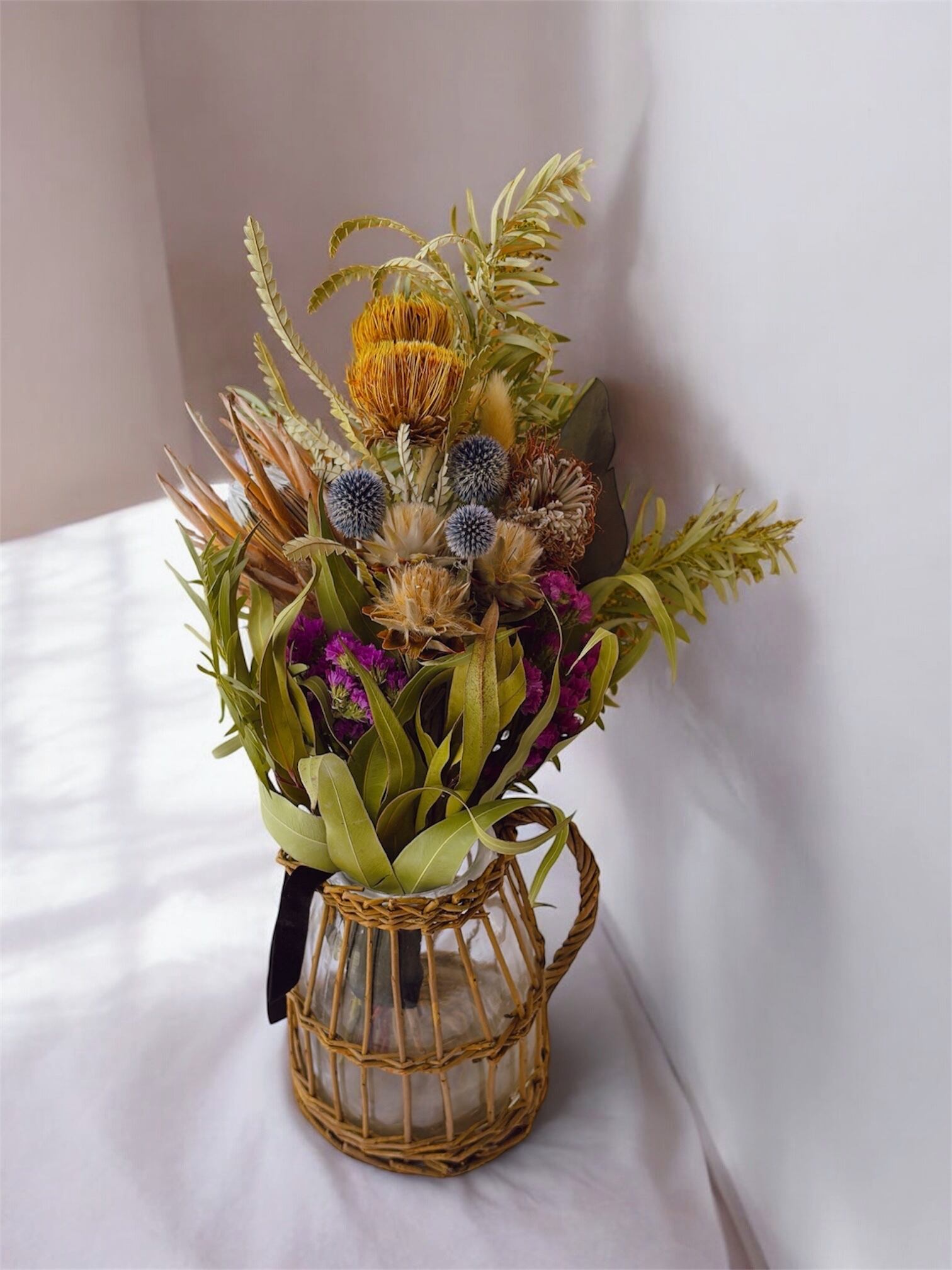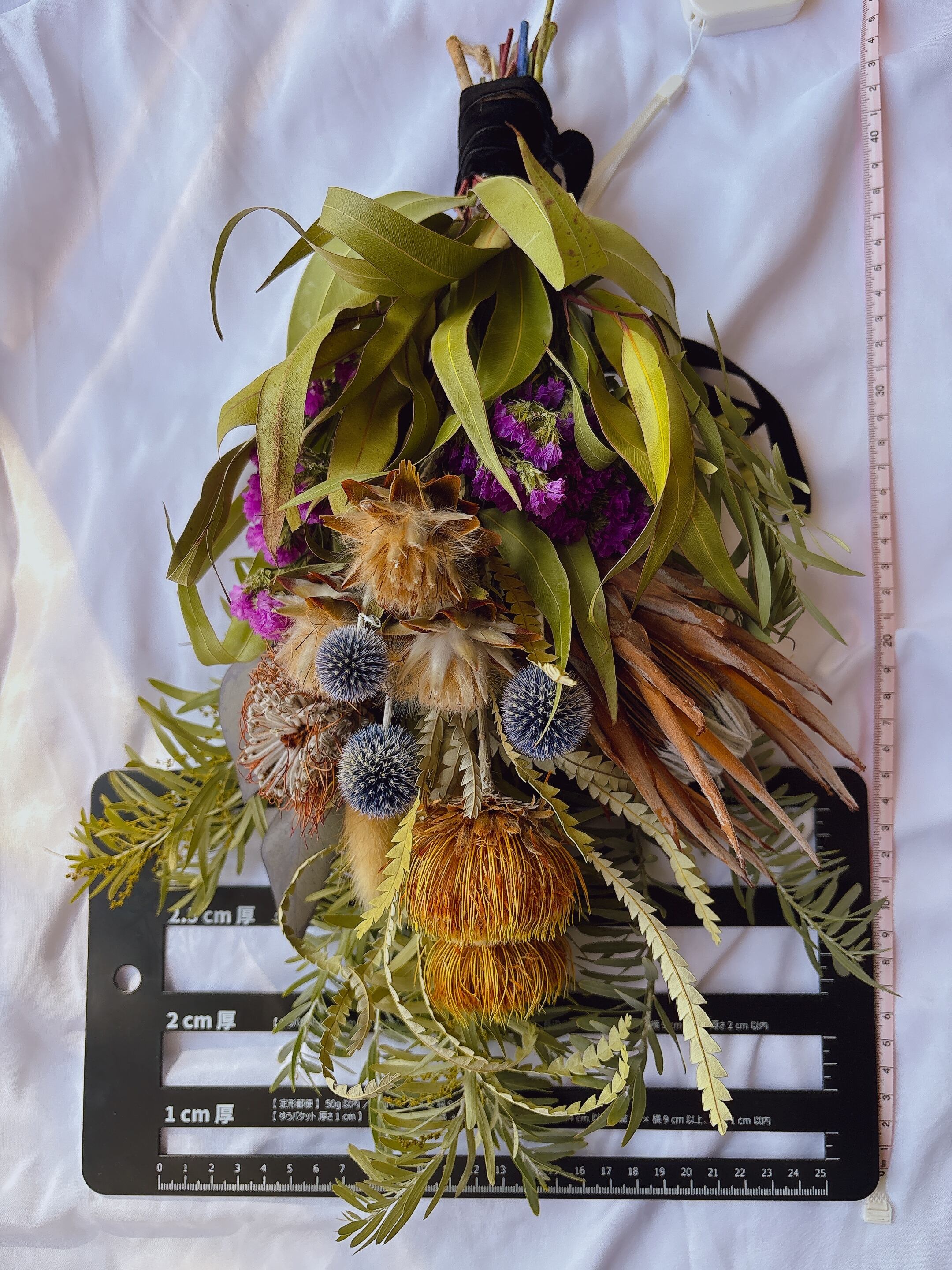 ・フォルモーサ、プロテア、瑠璃玉アザミ、ユーカリ、ミモザなど