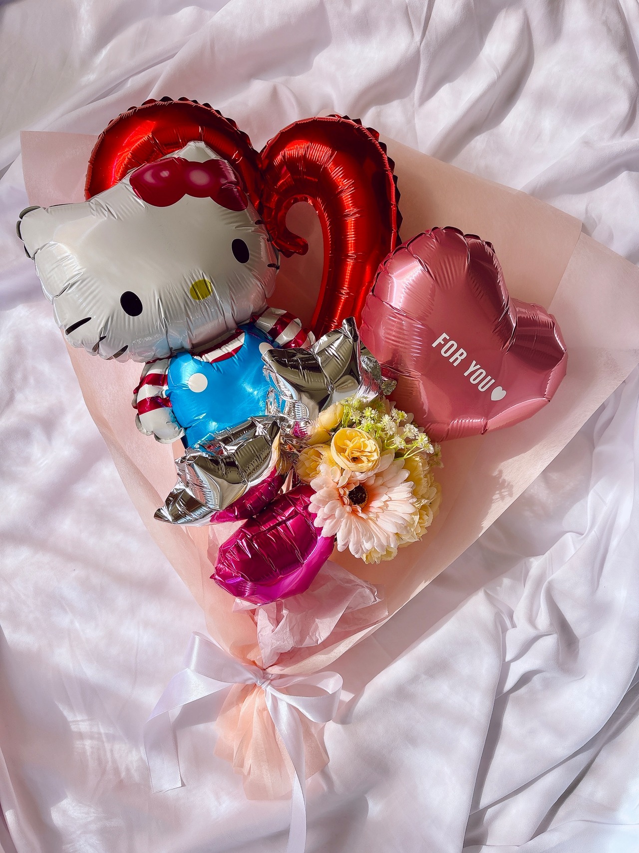 こちらはキティのバルーンやかすみ草、デイジーなどアーティフィシャルフラワーをたっぷり使用した花束です 。