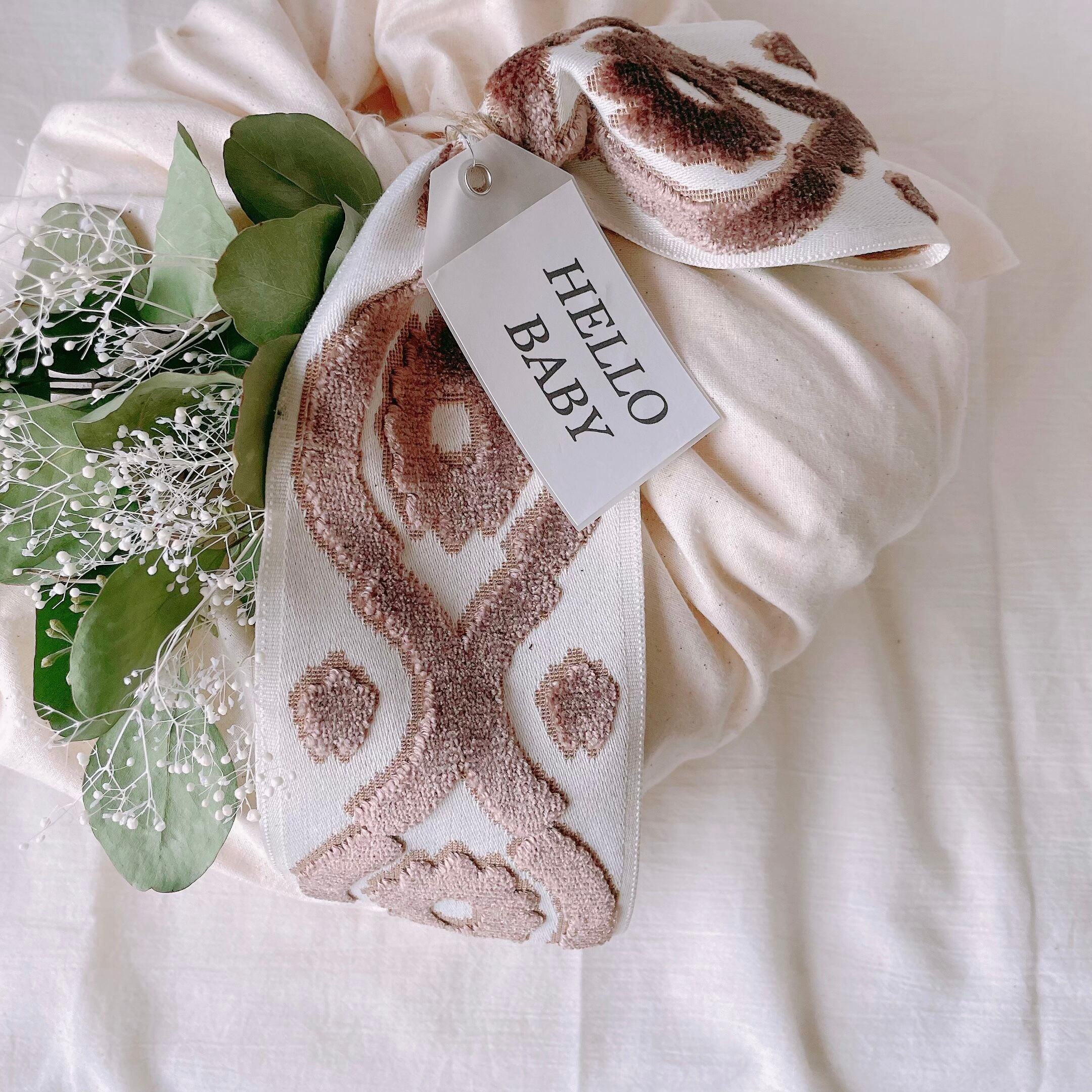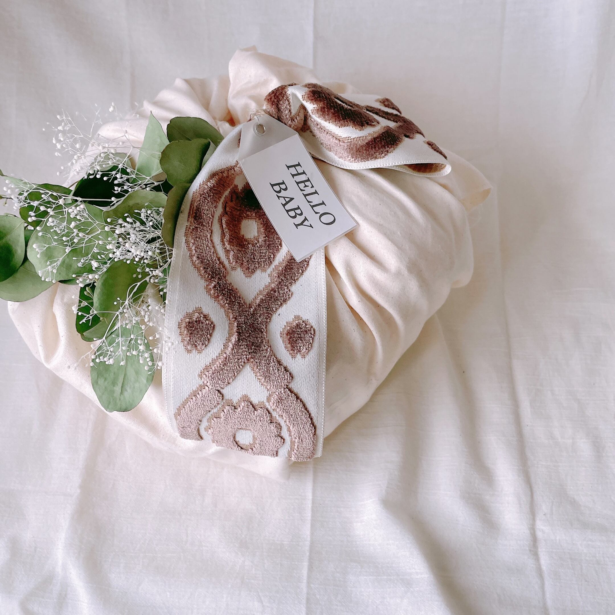 ナチュラルな季節のスワッグと海外産の刺繍リボンがセットになったオムツケーキ。