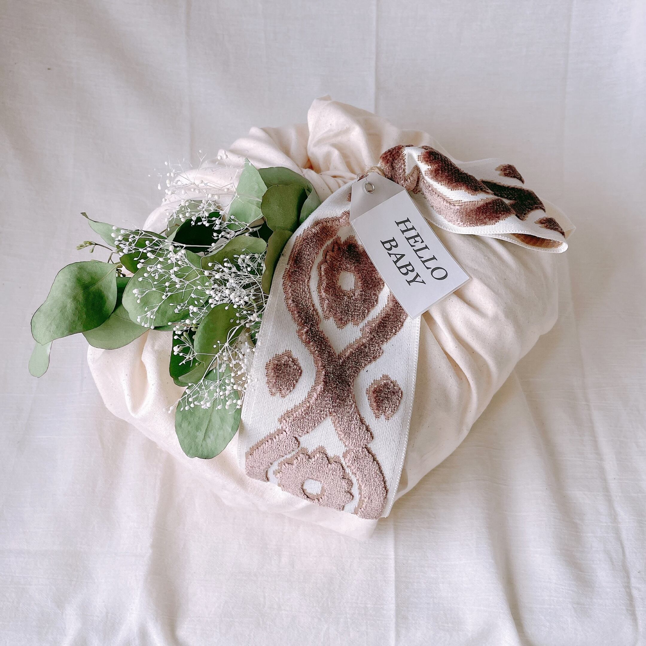 ・かすみ草、ユーカリポポラス、オムツ、布、梱包用のビニール、紙タグ、刺繍リボンなど