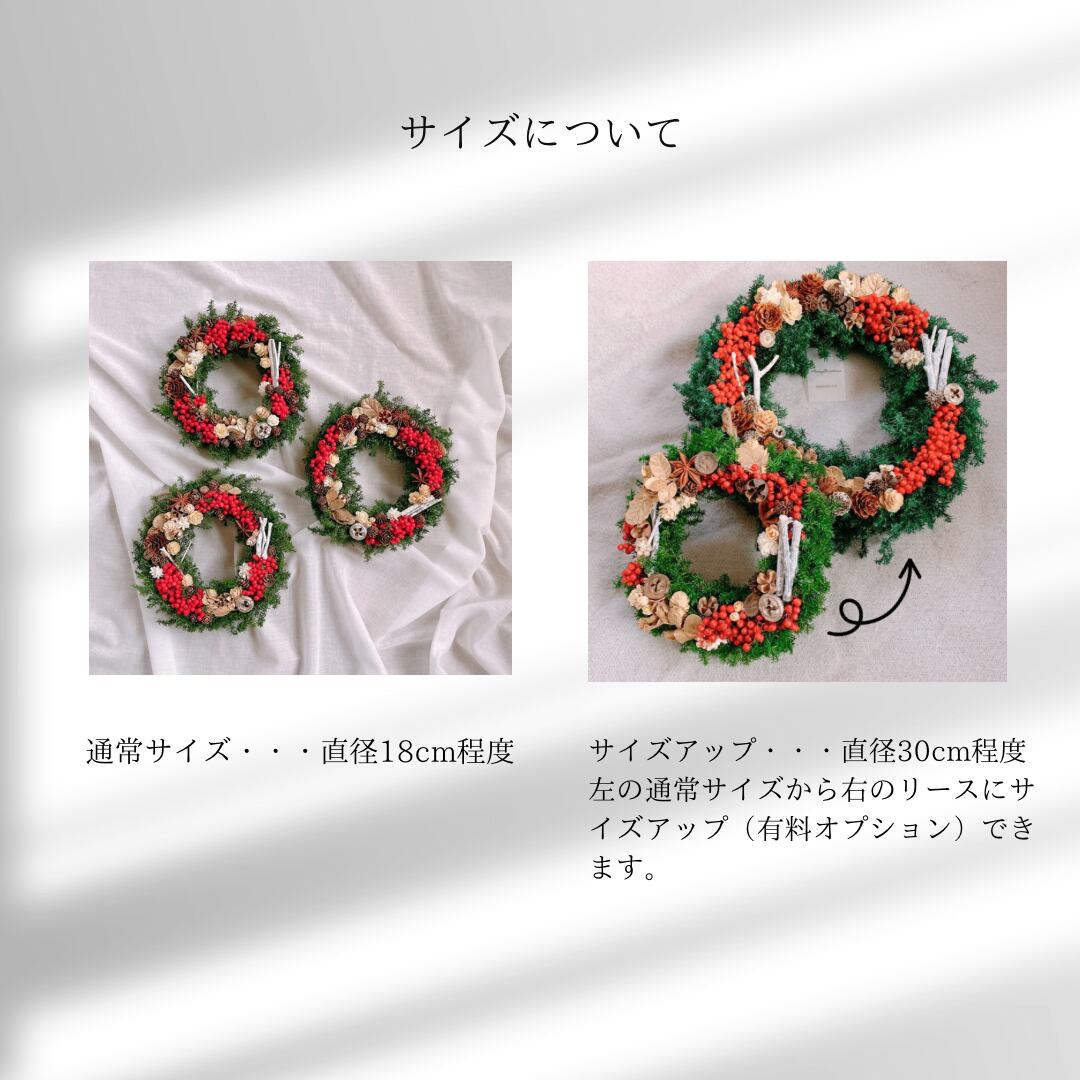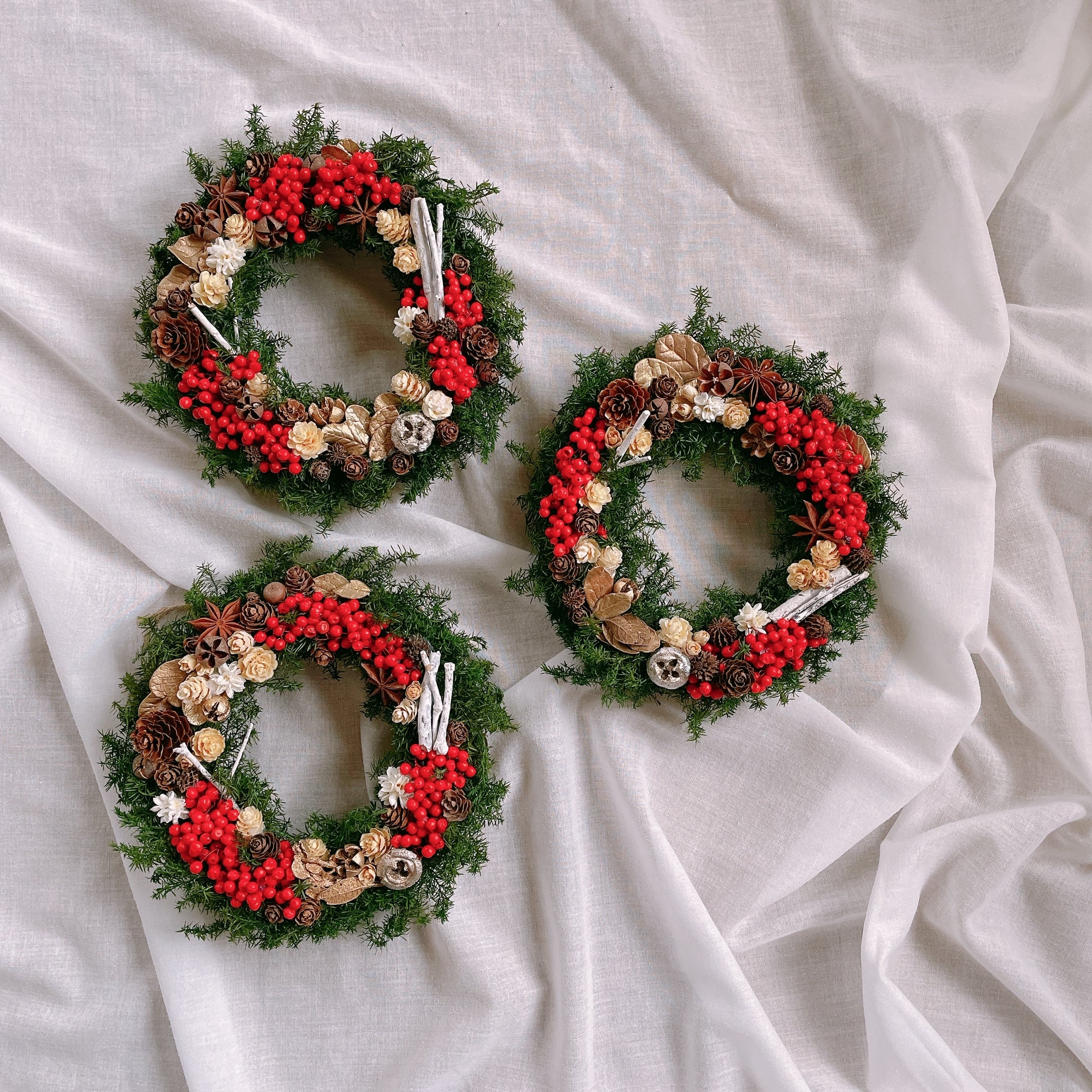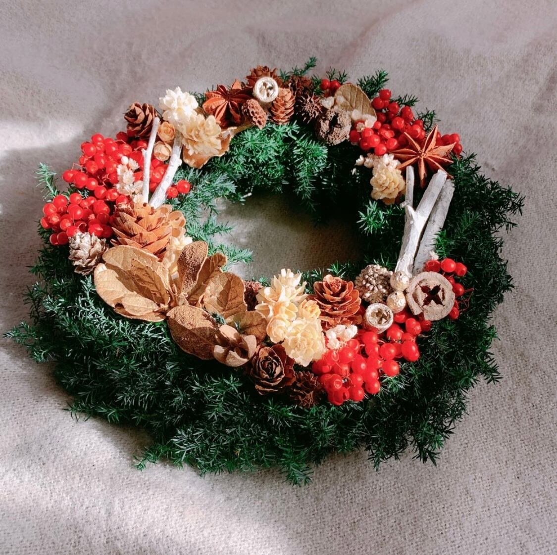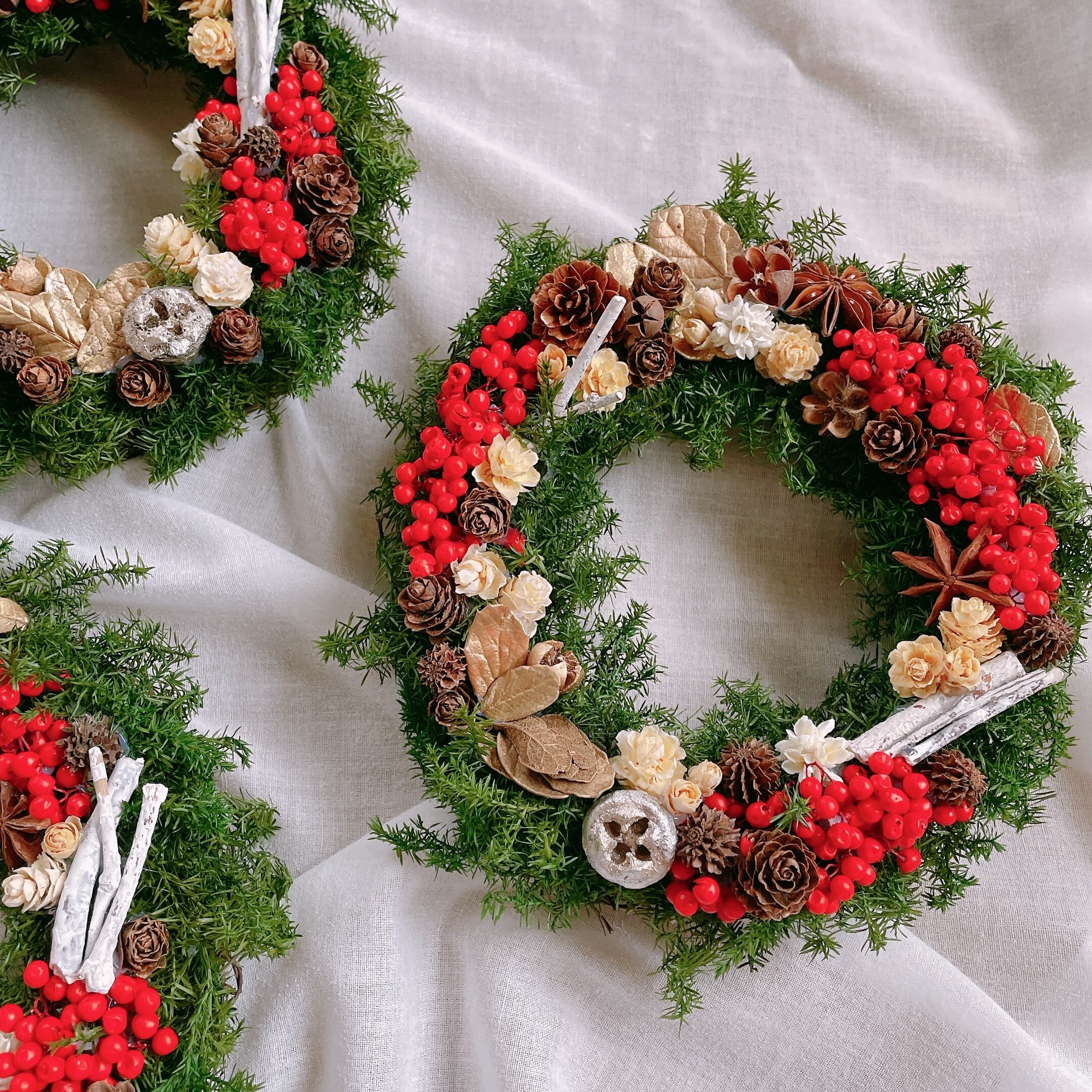 プリザーブドフラワーのヒムロスギを使用したこのクリスマスリースは、自宅の玄関やリビングにぴったりのアイテムです。
